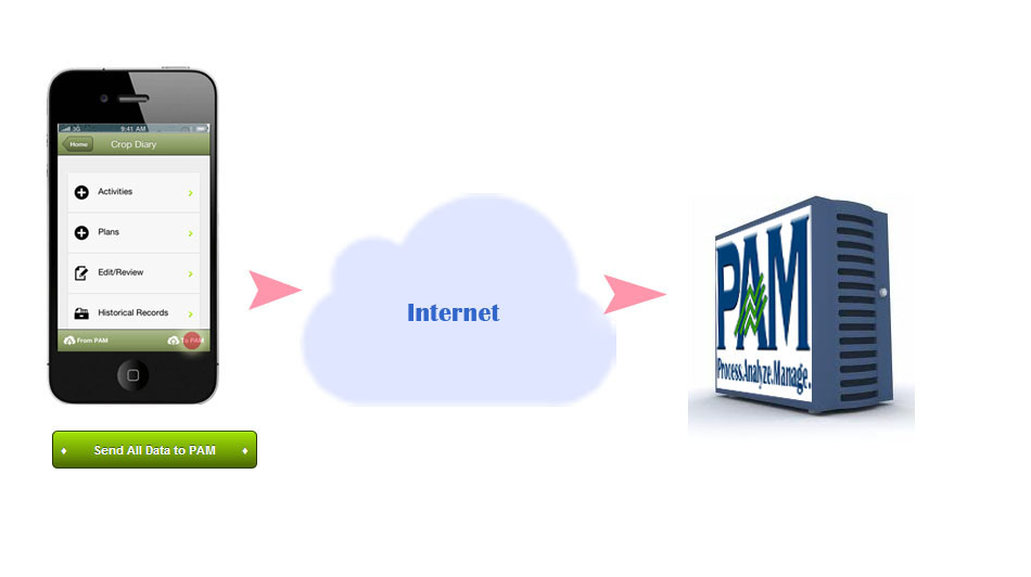 Enviar datos a PAM desde PocketPAM2: puedes tocar el botón "aPAM" desde la pantalla principal del módulo (Ej. Diario de Cultivo) o toca el botón "Enviar Todos los Datos a PAM" en la pantalla de Configuraciones de Sincronización para enviar datos a PAM desde todos los módulos PocketPAM2.